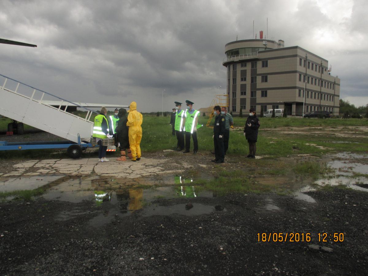 В соответствии с Планом основных организационных мероприятий, в целях обеспечения санитарной охраны и санитарно-эпидемиологического благополучия населения Калининградской области, 18мая 2016 года проведена учебная тренировкапо отработке навыков действий государственных контрольных органов, служб в международном аэропорту «Храброво» , а также персонала медицинских организаций при получении информации от командира воздушного судна о нахождении на борту больного/подозрительного на инфекционное заболевание.