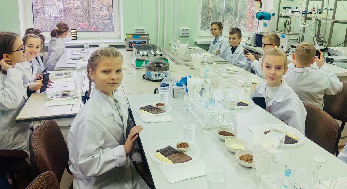 Урок провела Елена Петренко – заведующая объединённой санитарно-химической лабораторией ФБУЗ «Центра гигиены и эпидемиологии в Калининградской области». Сначала школьникам выдали белоснежные халаты – ведь именно в таких работают специалисты. Ребята узнали о происхождении шоколада - любимого лакомства, изучили его органолептические качества, поняли, чем отличается белый, молочный, тёмный шоколад, и затем самостоятельно провели исследование – определили содержание сахара в шоколаде.