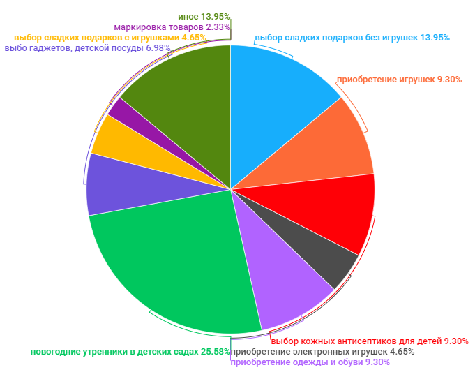 В первую очередь, граждан интересовали вопросы по выбору сладких подарков без игрушек (состав сладких подарков, ассортимент конфет, требования к маркировке) - 6 обращений. На втором месте обращения по приобретению игрушек и средств для дезинфекционной обработки рук детей - по 4 обращения. На третьем месте консультации по приобретению электронных игрушек, одежды и обуви - по 2 обращения.