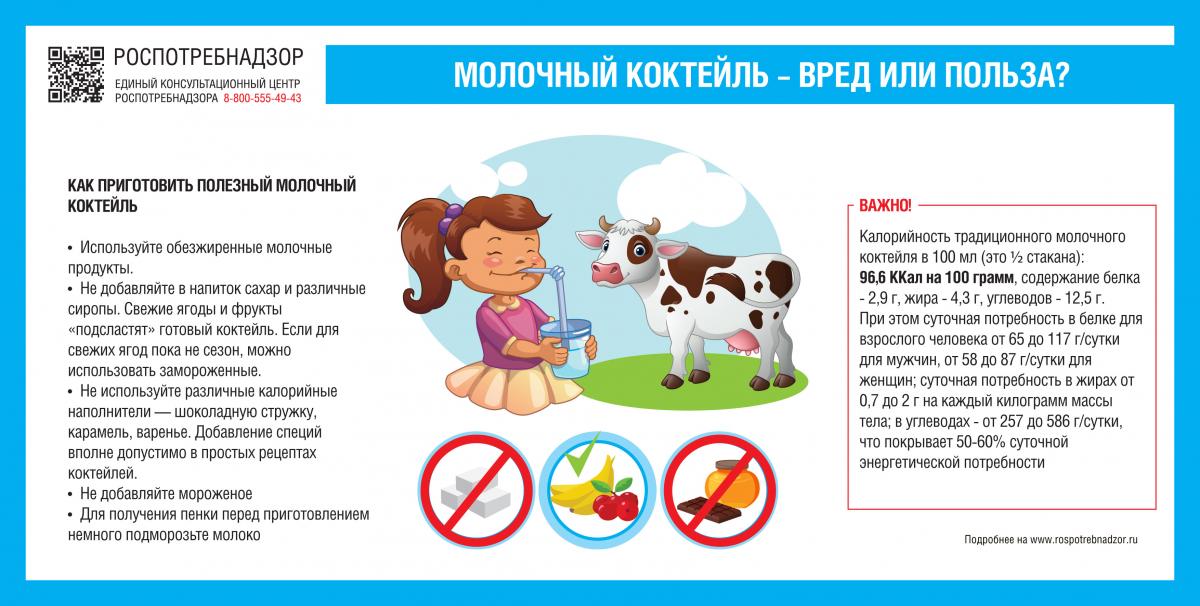 Роспотребнадзор напоминает, что молочный коктейль считается крайне неоднозначным продуктом. С одной стороны, он очень вкусный и калорийный, а с другой стороны, его компоненты все-таки содержат полезные для организма вещества, если приготовить его дома из молока низкой жирности, без сахара, с добавлением свежих фруктов или овощей.