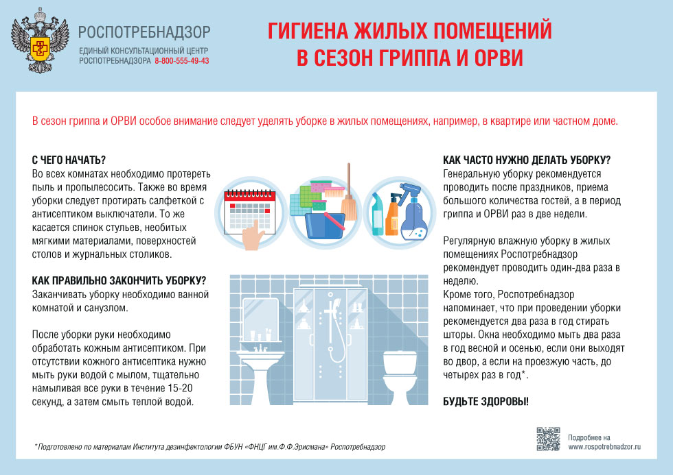 Как часто нужно делать уборку? Генеральную уборку рекомендуется проводить после праздников, приема большого количества гостей, а в период гриппа и ОРВИ раз в две недели. Регулярную влажную уборку в жилых помещениях Роспотребнадзор рекомендует проводить один-два раза в неделю. Кроме того, Роспотребнадзор напоминает, что при проведении уборки рекомендуется два раза в год стирать шторы. Окна необходимо мыть два раза в год весной и осенью, если они выходят во двор, а если на проезжую часть, до четырех раз в год. Будьте здоровы!