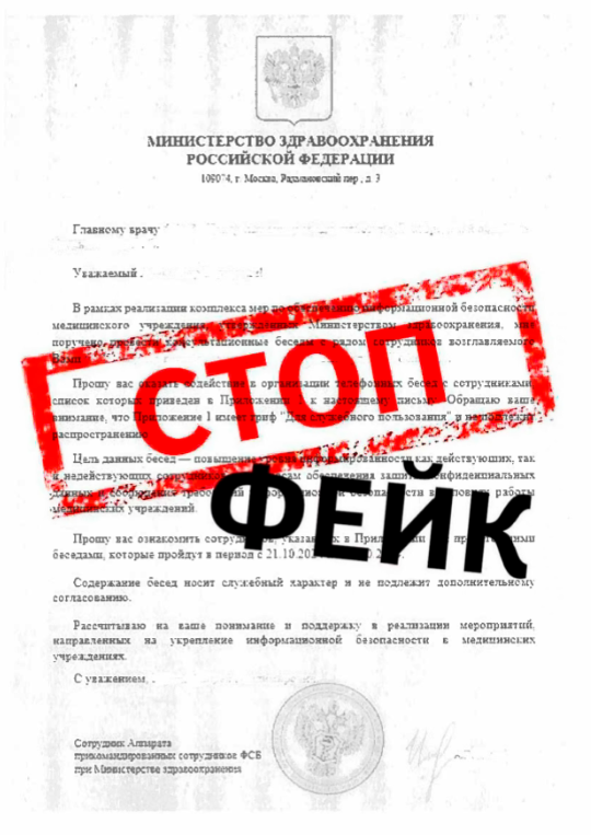Роспотребнадзор предупреждает руководителей предприятий, организаций, учреждений, индивидуальных предпринимателей, что продолжает поступать информация о распространении информационных писем от лиц государственных органов, в том числе Министерства здравоохранения Российской Федерации, представителей правоохранительных органов с просьбой оказать содействие в организации телефонных бесед с сотрудниками возглавляемых Вами организаций, с целью «повышения уровня информированности сотрудников по вопросам обеспечения защиты конфиденциальных данных и соблюдения требований информационной безопасности в условиях работы медицинских учреждений».