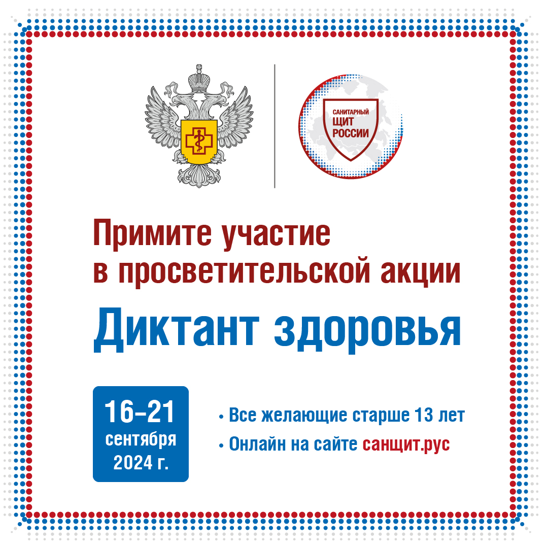 В России с 16 по 21 сентября пройдет федеральная образовательная акция «Диктант здоровья». Цель мероприятия – популяризация санитарно-гигиенической грамотности и норм здорового образа жизни.